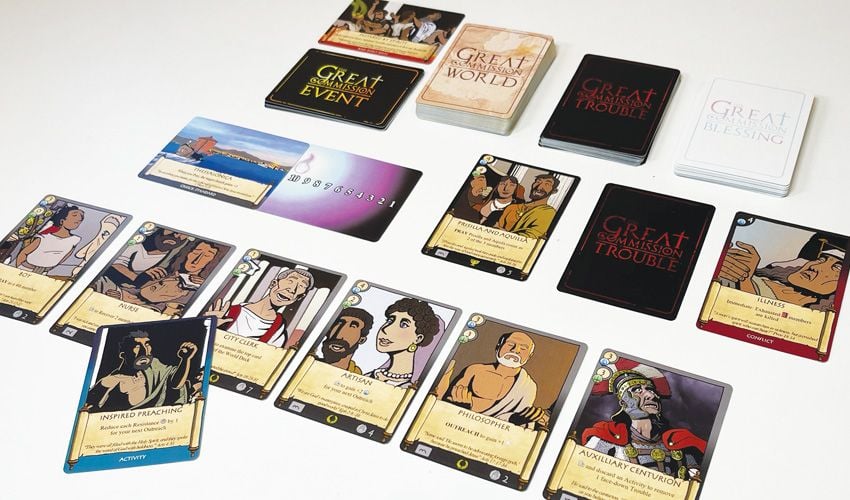 NOT SATIRE: The Great Commission Strategic Card Game is a cooperative (or solo) strategy game where you take on the challenge of leading a church in the tumultuous Roman era. Manage diverse personalities, each contributing their own unique abilities and gifts, but also bringing their struggles with sin, conflict or even demonic opposition. The goal is to share the gospel and assemble your church before your time runs out!
