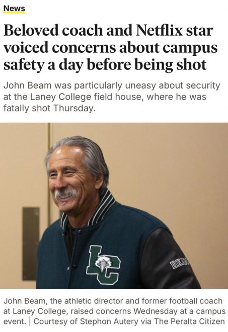 Beam, 66, raised concerns specifically about security at the Laney College field house, citing a nearby fire and a previous break-in. He made the comments Wednesday at a “Taco ’Bout Safety” event on campus. He was shot in the field house Thursday, and police announced his death Friday.