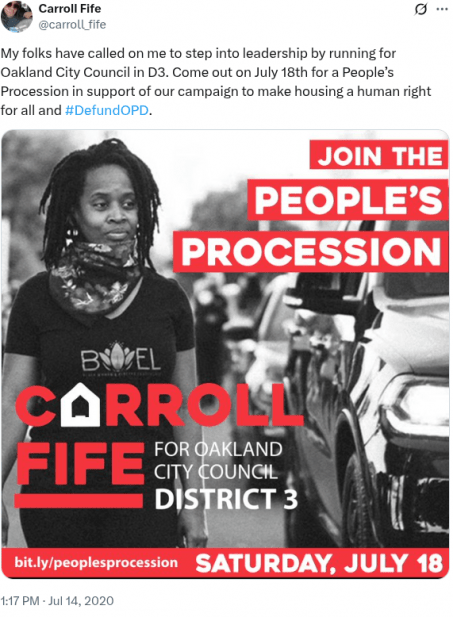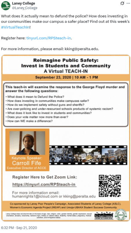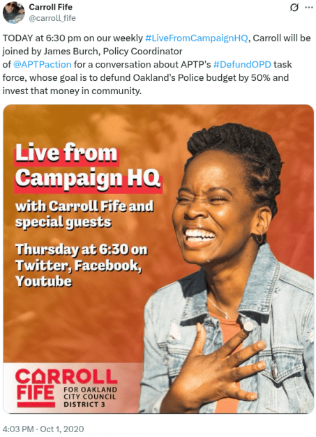 Note that Fife used the hashtag #DefundOPD (Defund Oakland Police Department) in her social media campaign and specifically promised a 50% reduction in the department’s budget. And in September 2020, Fife was the keynote speaker for a “virtual teach-in” promising to “answer the following questions”: