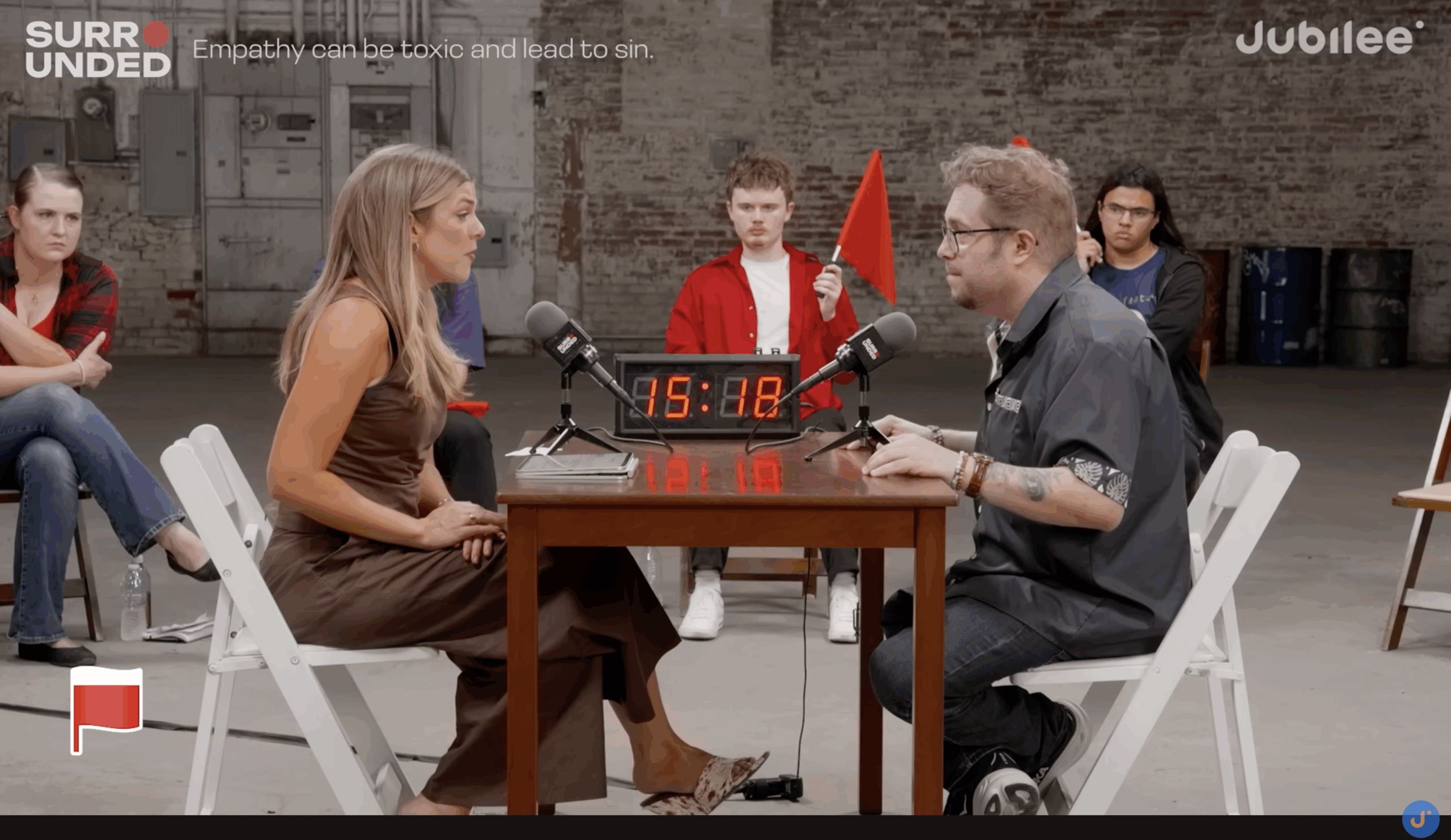 “Surrounded” is produced by Jubilee Media. The series pits one notable figure against a group of 20 opponents. People literally sit in a circle around the featured person sitting at a debate table and jump into debate when given the opportunity.