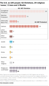 There were roughly 262 million adults in the United States, among whom are about 162 million Christians (and 76 million people who have no religion). Such huge numbers make it difficult to fully understand America’s religious landscape. But what if we imagined the U.S. as a small town of just 100 people? In this scenario, 62 would be Christian. With so many Protestant groups, it’s hard to break them down, denomination by denomination, but the largest group would be the 23 Evangelical Protestants, and there’d be 19 Catholics.