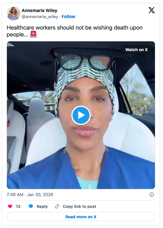 “To my fellow health care professionals: You cannot wish death upon people and then post it to the internet,” she began, before showing Cook urging her colleagues to paralyze and possibly murder ICE agents.