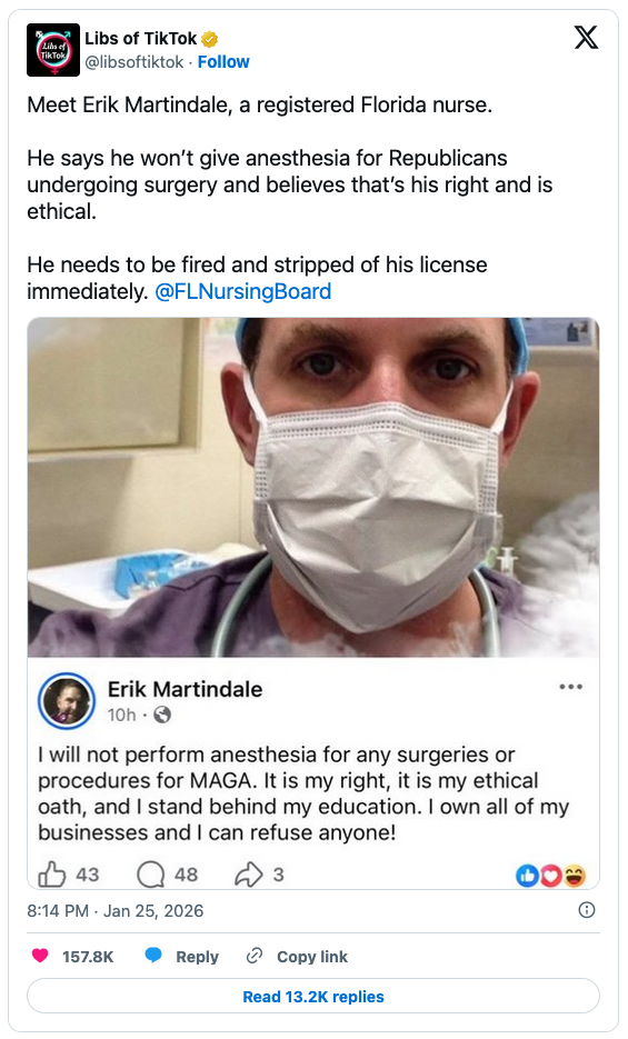 Now, a nurse anesthetist, Erik Martindale, has surrendered his license because he doesn’t want to care for “MAGA,” meaning supporters of President Donald Trump and other Republicans. He said so in a viral video picked up by Libs of TikTok.