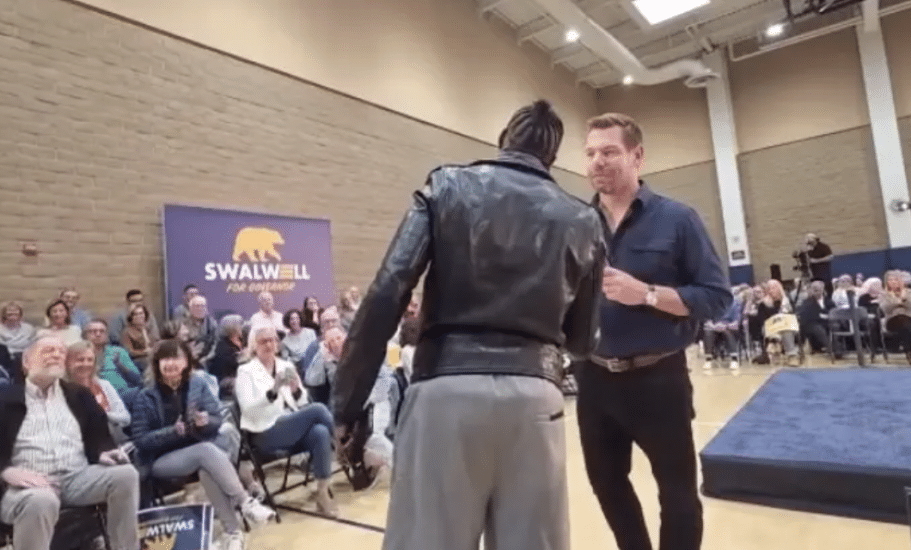 At a campaign event in Orange County, Hyman pressed Swalwell on whether he would allow “men in women’s rooms” if he became governor.