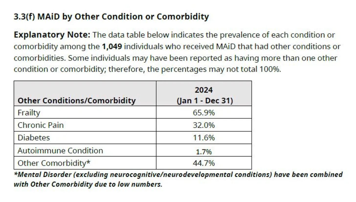But the most chilling number? 35% of BC euthanasia approvals were for “other conditions.” Of those, nearly two-thirds were classified as “frailty.” Yep you read that right. “FRAILTY”