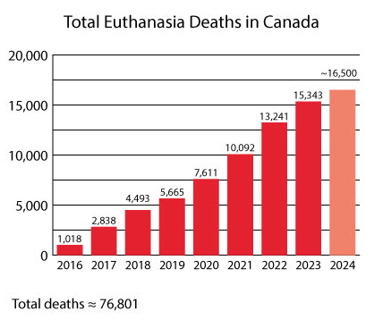 Alex Schadenberg, Executive Director of the Euthanasia Prevention Coalition, estimates that in 2024, around 16,500 Canadians killed themselves via physician-assisted suicide – an increase of roughly 7.5% over 2023. A staggering 5% of deaths in Canada are now attributable to euthanasia, and that number is only growing.