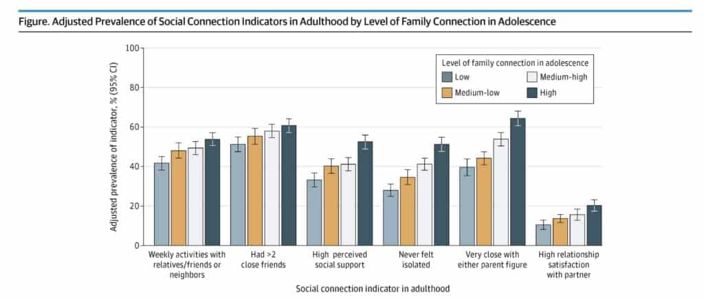 Specifically, this research team reported that high levels of meaningful social connection were“more than twice as common” for adults who had “high” levels of family connectedness as adolescents compared to peers who grew up with the lowest levels of family connectedness.