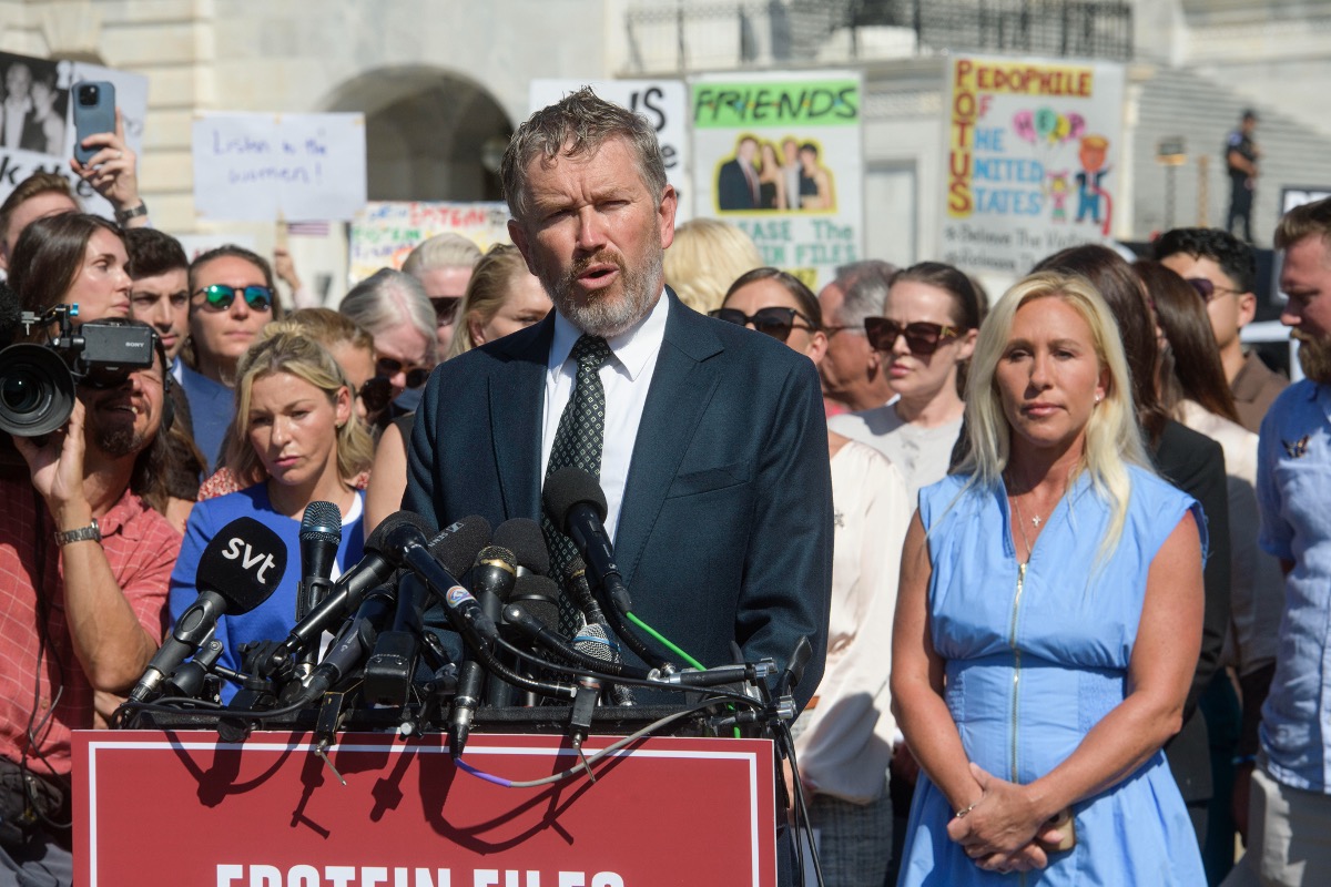 The conversation then shifted to the ongoing government shutdown. Massie criticized the House of Representatives’ current recess during the government shutdown, which he said was “unprecedented,” and accused Speaker Mike Johnson (R-La.) of delaying the swearing-in of a newly elected member of Congress (Representative-elect Adelita Grijalva of Arizona) in order to block a discharge petition to release the Epstein files. The petition would require the release of all of the government’s files regarding Jeffrey Epstein, as well as his client list (while protecting the names of the victims).