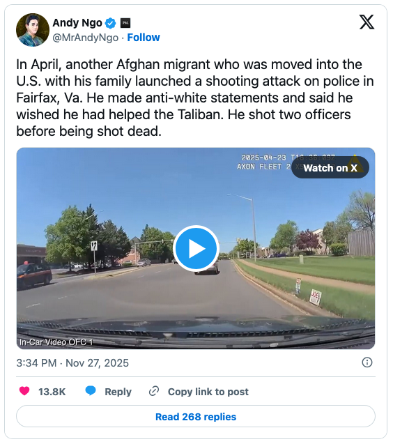 But the Afghans have graduated to terror and murder … of Americans. Beckstrom’s murder in Washington, D.C., prompted President Donald Trump to announce on Truth Social an end to Third World immigration.