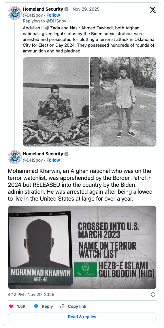 The week before that, Afghan Biden “migrant” Abdullah Haji Zada was sentenced to prison for plotting a terror attack on Election Day 2024. His co-conspirator, also an Afghan Biden “migrant,” has not been sentenced.
