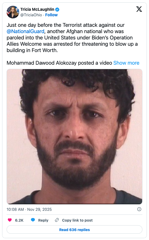 Alokozay, who landed here under Biden’s Operation Allies Welcome, “was arrested for threatening to blow up a building in Fort Worth,” she wrote on X: