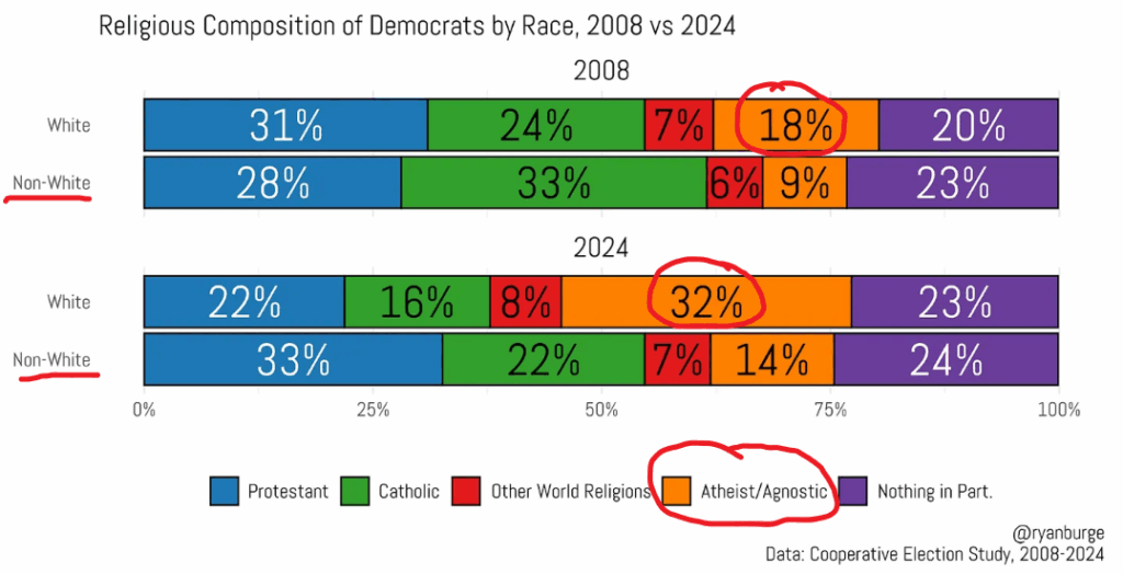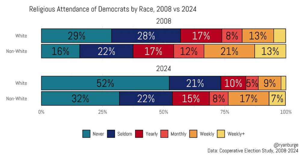 White and Hispanic Democrats have gotten increasingly more secular, essentially doubling, while their Black and Asian voters have not shifted more secular by much between 2008 and 2024. Burge explains, “In other words, the ‘average American’ looks a lot like the ‘average Democrat of color’ in terms of religious activity.” But their white members are increasingly secular and liberal.