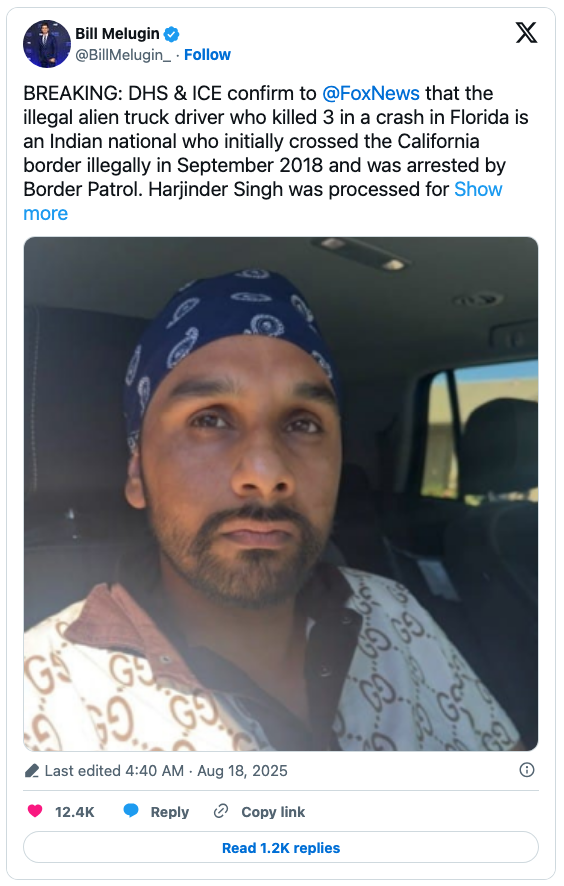 Yet another Indian illegal named Singh, first name Harjinder, killed three people in Florida, authorities allege.