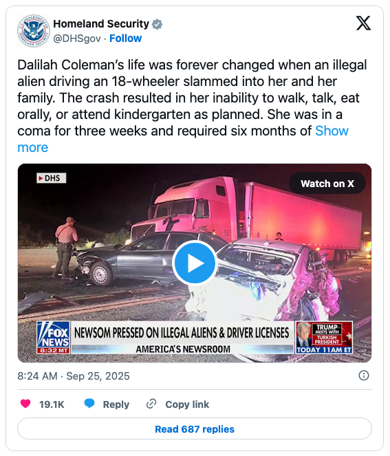 On June 20, 2024, as DHS reported, Indian illegal Partap Singh “caused a multi-pile car wreck while driving an 18-wheeler” in California that left 5-year-old Dalilah Coleman “with critical, life altering injuries.” ICE arrested him in August. Singh jumped the border in October 2022, and the Biden administration promptly released him.