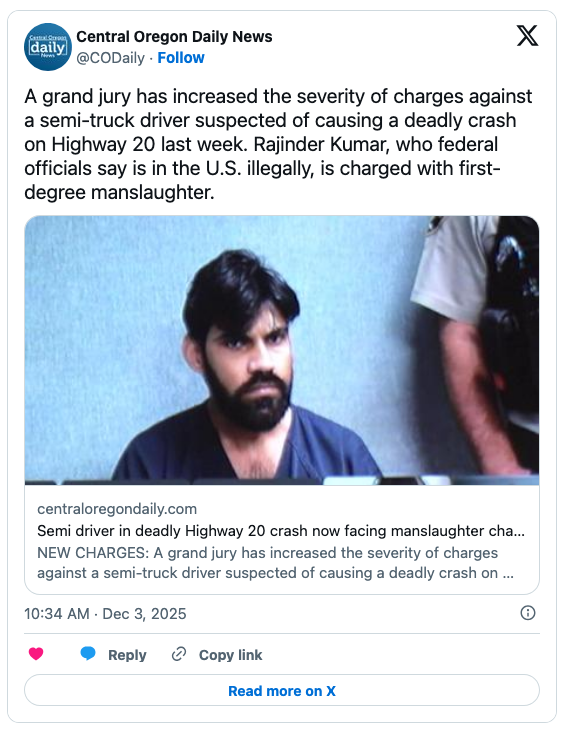 DHS: Truck-driving Indian Illegal Alien Released at Border Kills Two in Oregon