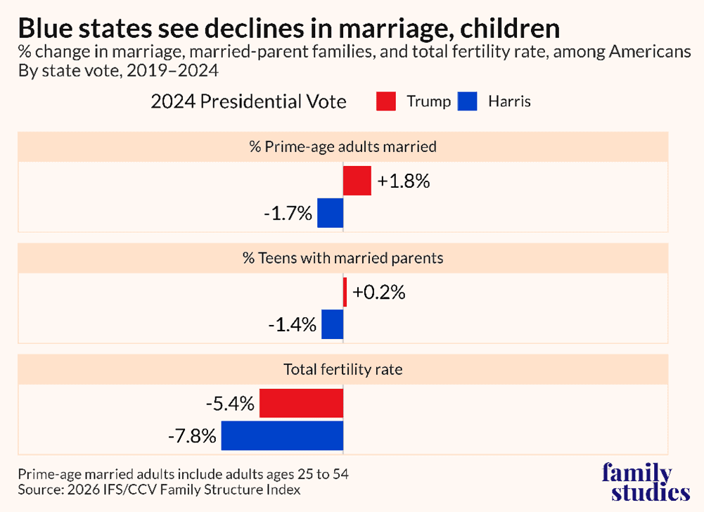 The Institute for Family Studies finds, “From 2019 to 2024, red states saw the share of prime-age adults who are married rise 1.8 percentage points and the share of teens in married-parent families rise 0.2 points; blue states saw both figures fall.”