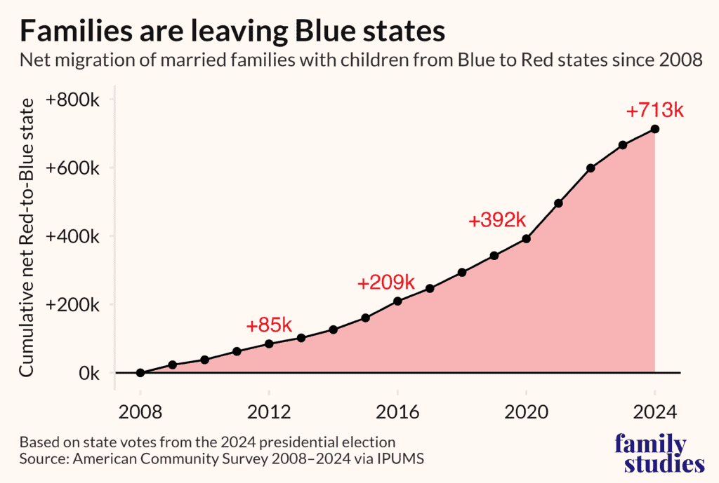 This is the finding of the 2026 Family Structure Index created jointly by Ohio’s Center for Christian Virtue and the Institute for Family Studies (IFS). They report, “From 2019 to 2024, there has been a steady exodus of families from Blue to Red America – 370,000 families from blue to red states.” In fact, 713,000 married families with children have packed up fromblue states and headed for red since 2008. With numbers like this, it’s likely you know such a family.