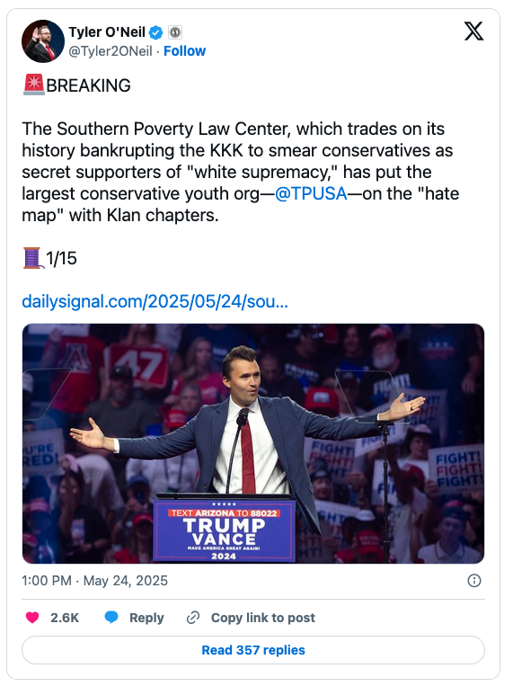 The “haters” include Turning Point USA, which the SPLC added to the map “mere months” before the assassination of TPUSA chieftain Charlie Kirk on September 10.