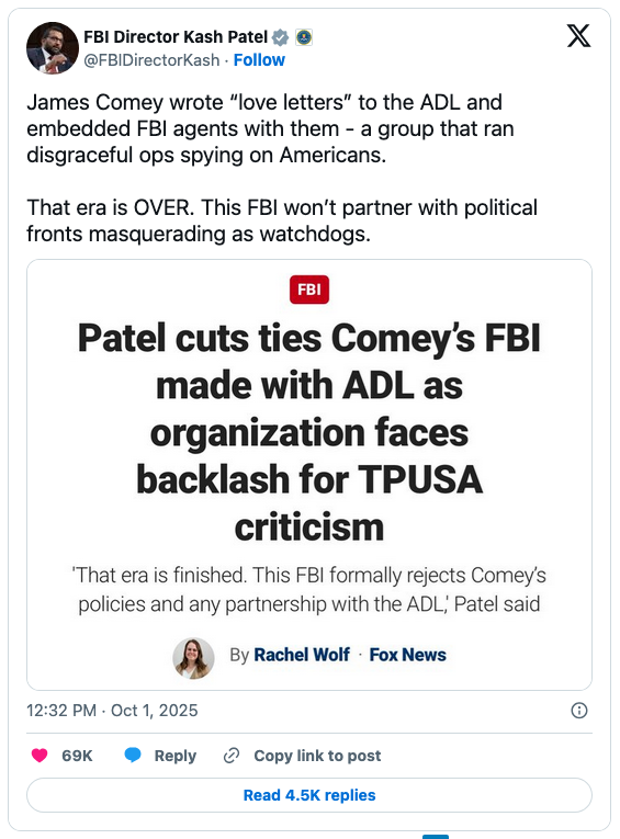 Disgraced former FBI chief “James Comey wrote ‘love letters’ to the ADL and embedded FBI agents with them — a group that ran disgraceful ops spying on Americans,” Patel wrote on X:
