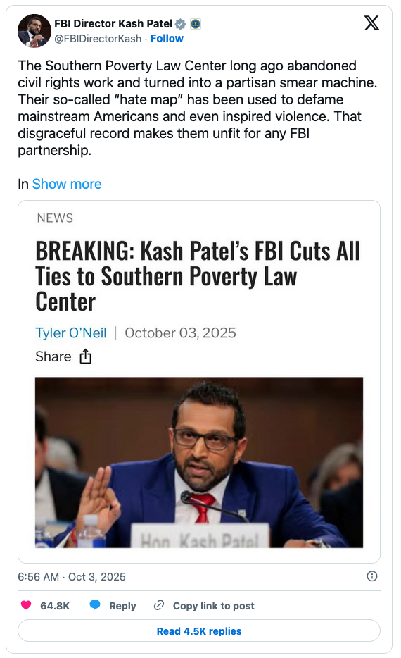 No more will the bureau work with the disgraced and discredited Southern Poverty Law Center (SPLC), FBI Director Kash Patel told The Daily Signal.