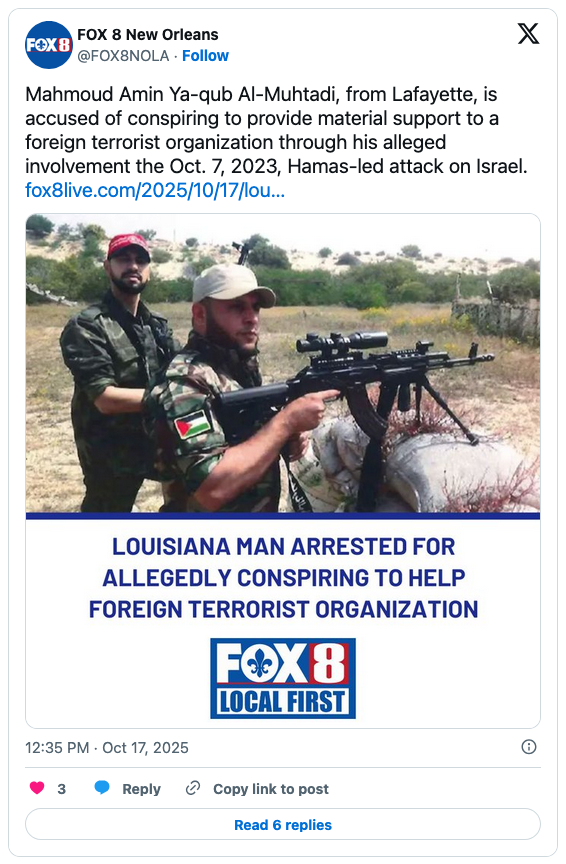 Arrested yesterday in Louisiana, he was involved with a communist outfit that joined Hamas for the attack, the complaint alleges.