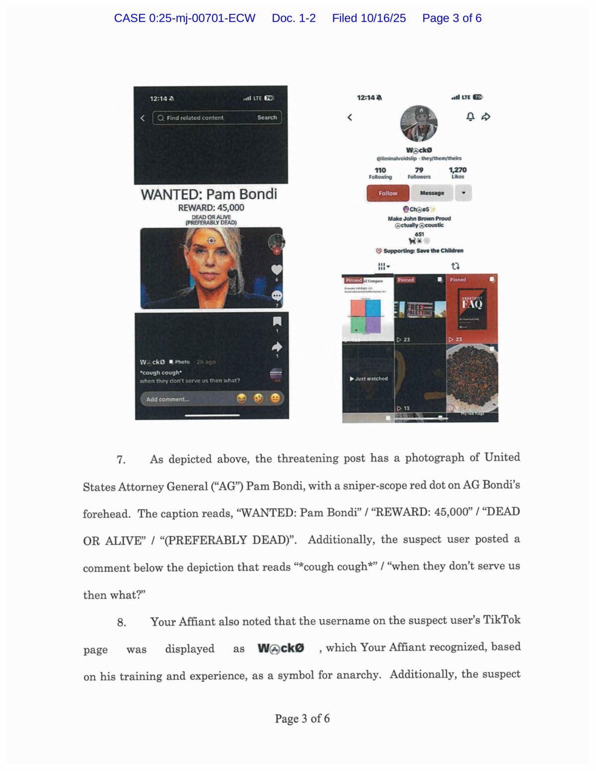 Avalos’ trouble began on October 9, when a TikTok user in Detroit reported the plot to the FBI National Threat Operations Center. The user reported “a threatening post against United States Attorney General Pam Bondi that had come across the user’s TikTok feed,” the affidavit alleges: