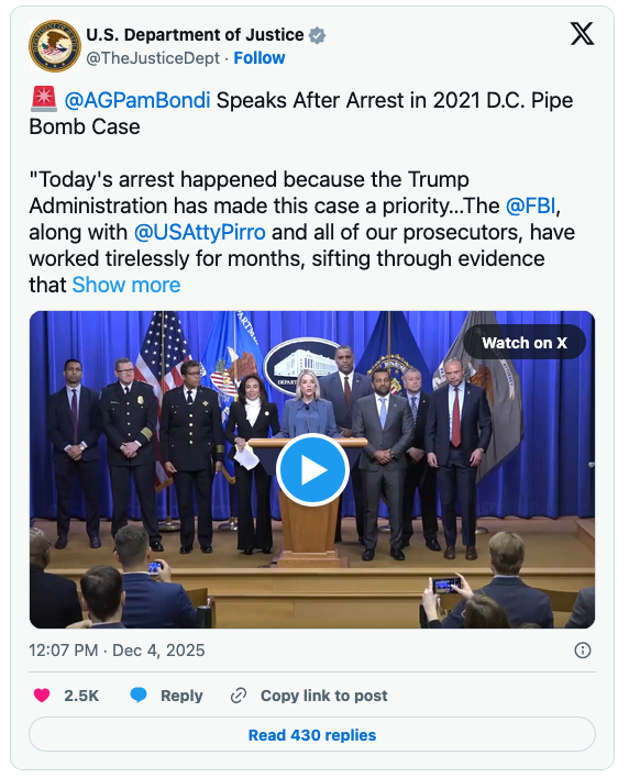 The total lack of movement on this case in our nation’s capital undermined the public trust of our enforcement agencies. This cold case languished for four years, until Director Patel and Deputy Director Bongino came to the FBI. The FBI, along with U.S. Attorney Pirro and all of our prosecutors, have worked tirelessly for months, sifting through evidence that had been sitting at the FBI with the Biden administration for four long years.… There was no new tip, there was no new witness — just good, diligent police work and prosecutorial work.