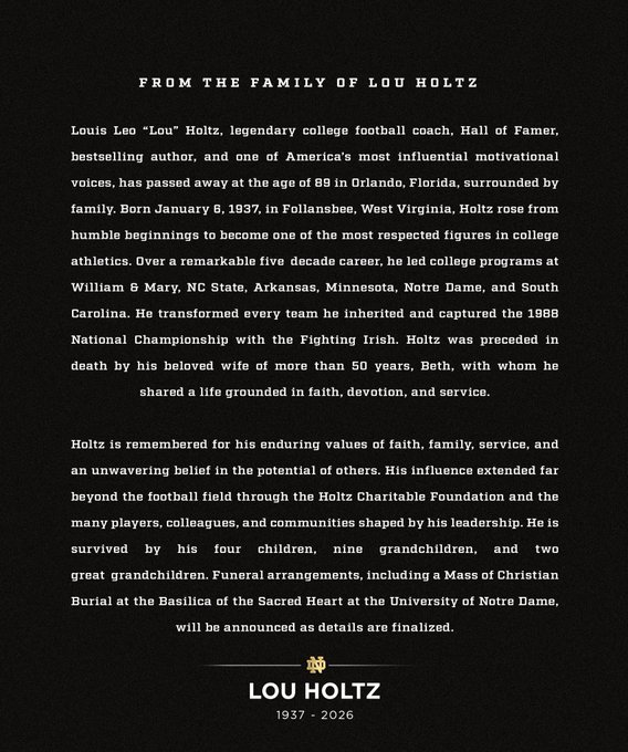 Former Notre Dame football coach Lou Holtz, a pro-life champion who led the Fighting Irish to the 1988 national college football championship, has passed away.