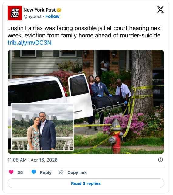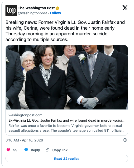Former Virginia Lieutenant Governor Justin Fairfax, whose rise to the state’s highest office was stopped cold by two accusations of sexual assault in 2019, murdered his wife and shot himself last night.