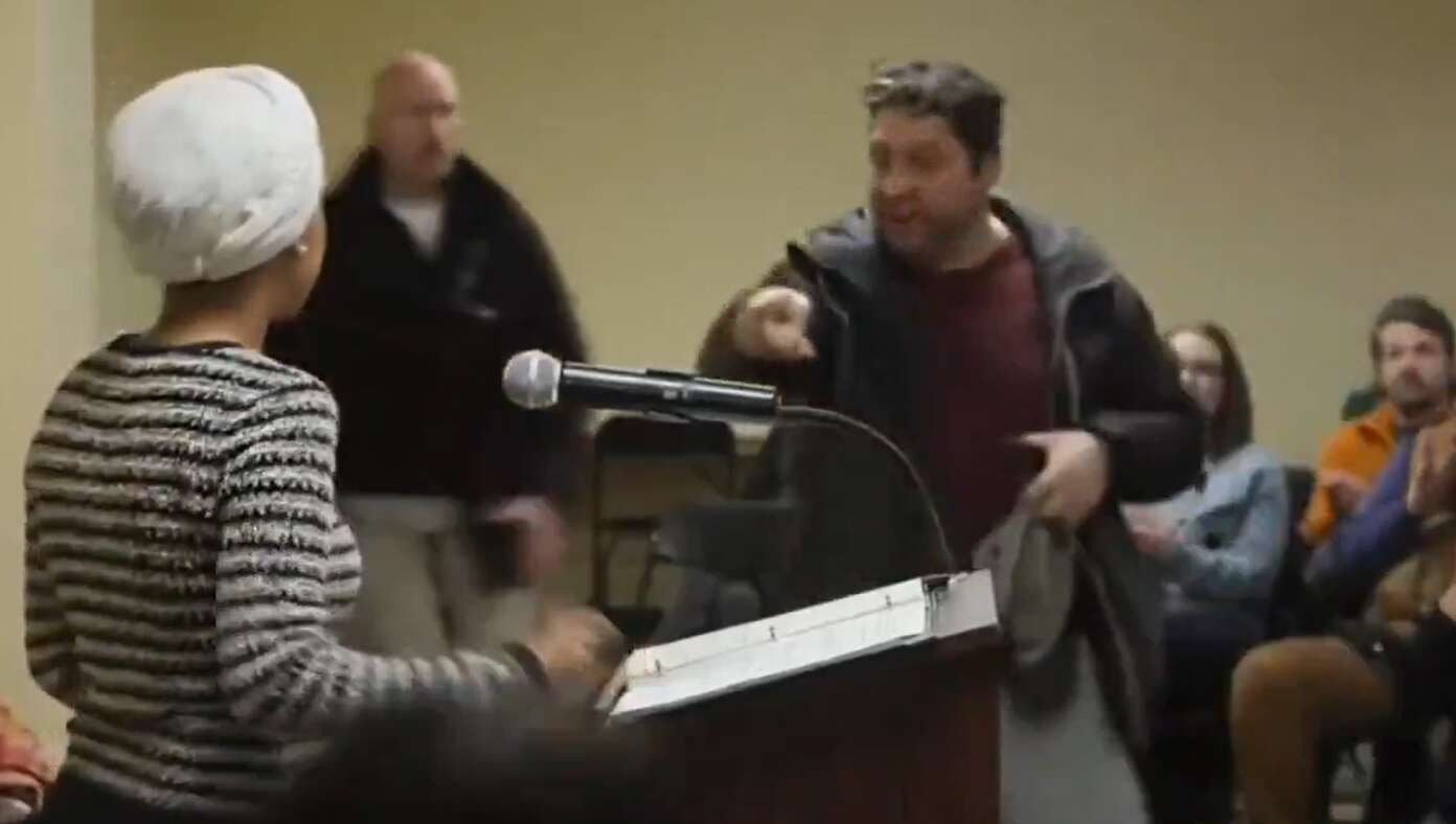A man seated on the front row of the town hall suddenly rose and began shouting at Omar midway through the event before spraying her with Somali cuisine that had been fed through a blender.