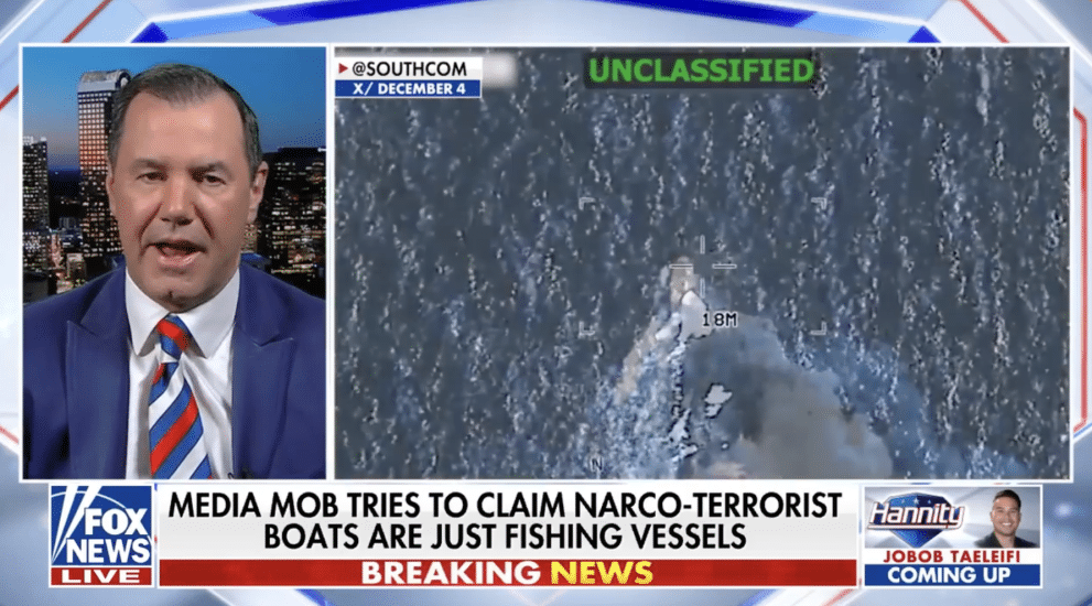 During Thursday night’s Hannity, Fox News contributor Joe Concha criticized Democrats and the media for portraying recent U.S. military strikes on Venezuelan drug boats — linked to the sanctioned Cartel de los Soles — as harmless fishing trips.