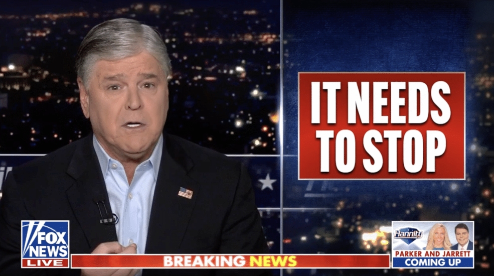 During Wednesday night’s Hannity, Fox News host Sean Hannity delivered an “urgent warning” to Americans: the vile, dehumanizing rhetoric coming from the left needs to stop — lives are being lost.