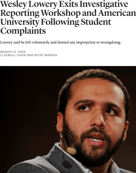 Wesley J. Lowery, a Pulitzer-winning investigative reporter and one of the most influential journalists of his generation, has left his positions as the executive editor of the Investigative Reporting Workshop and as an associate professor of journalism at American University in Washington, DC, after less than two years there. His departure follows a number of complaints against him, according to former colleagues, including at least three Title IX allegations, in which he was accused of improper behavior with colleagues and female students.