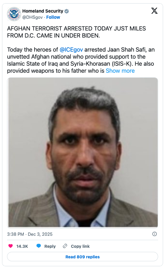 “He applied for Temporary Protected Status (TPS) but his application was terminated once Secretary Noem ended TPS for Afghans,” DHS reported. ICE bagged him yesterday.