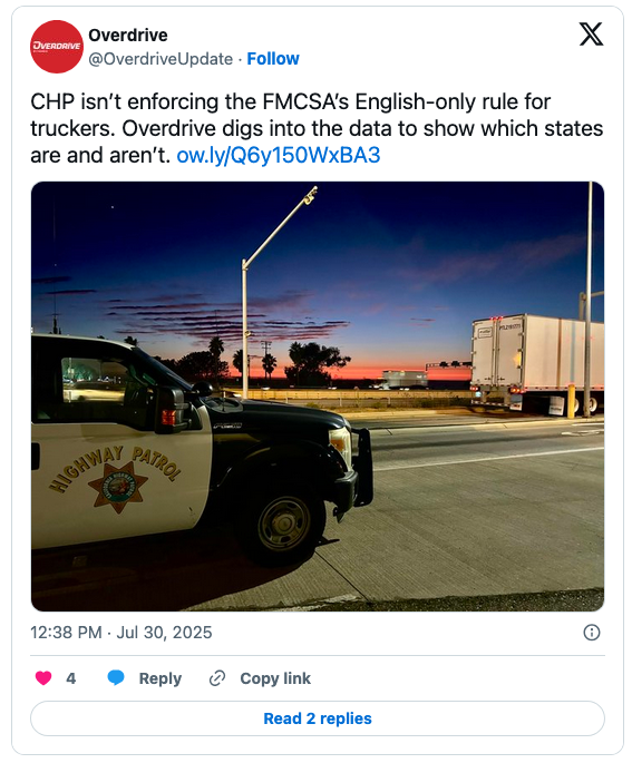 In July, the Overdrive Online website reported that “California Highway Patrol said it’s not putting drivers out-of-service for not speaking English despite new federal guidance on the rule.”