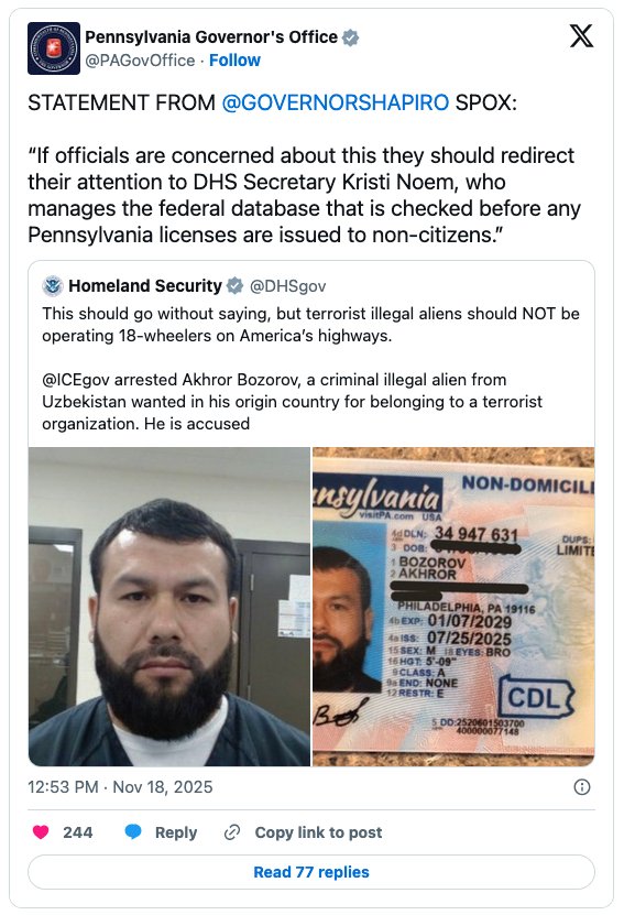 “If officials are concerned about this they should redirect their attention to DHS Secretary Kristi Noem, who manages the federal database that is checked before any Pennsylvania licenses are issued to non-citizens,” a spokesman for Shapiro replied on X.