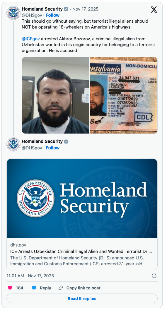 ICE collared Bozorov on November 9 in Kansas, where he worked as a commercial truck driver. “Governor Josh Shapiro’s Pennsylvania issued him” the license, DHS reported. “The Biden administration granted him work authorization in January 2024.”