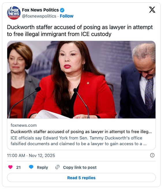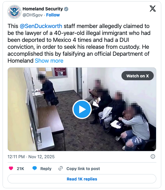 “This @SenDuckworth staff member allegedly claimed to be the lawyer of a 40-year-old illegal immigrant who had been deported to Mexico 4 times and had a DUI conviction, in order to seek his release from custody,” DHS reported on X: