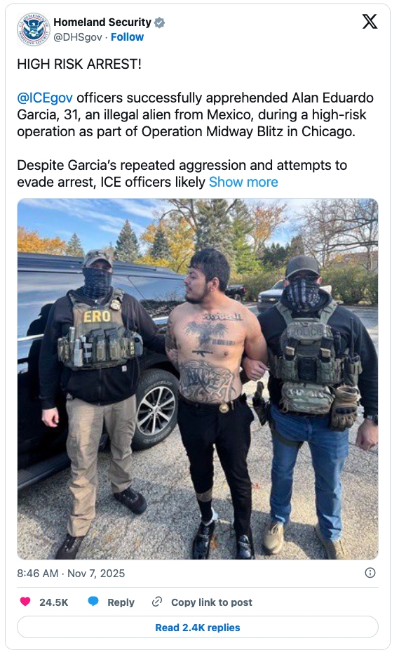 On Nov. 5, ICE officers observed Garcia exiting his apartment and entering his vehicle. Garcia again attempted to assault officers by striking their vehicles and fleeing at high speed. He abandoned his vehicle and fled on foot, barricading himself inside his apartment.