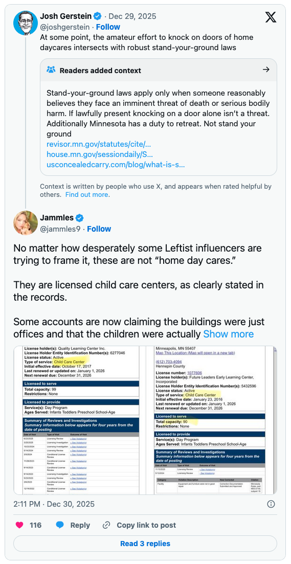 But Gerstein erred twice in the post, critics observed. Minnesota is not a stand-your-ground state. And the fraud does not involve “home daycares.”