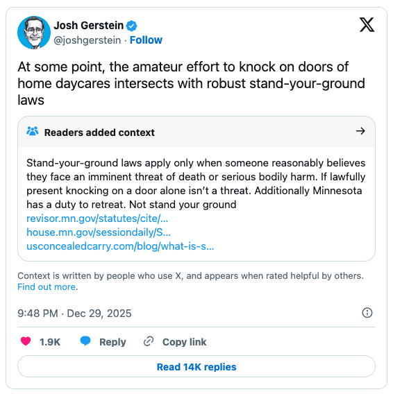 Senior legal affairs reporter Josh Gerstein was apparently referring to journalist Nick Shirley, who exposed so-called daycare centers that didn’t have any children under their care. Shirley’s probe, Gerstein wrote, might “intersect” with “stand-your-ground laws.”