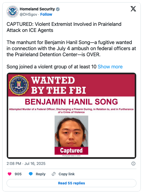 On September 24, Joshua Jahn attempted the mass murder of ICE agents at their facility in Dallas. Firing with a rifle from a nearby rooftop, Jahn did not hit an agent, but did murder two illegal aliens before he turned the gun on himself. He had written anti-ICE messages on the bullet casings.