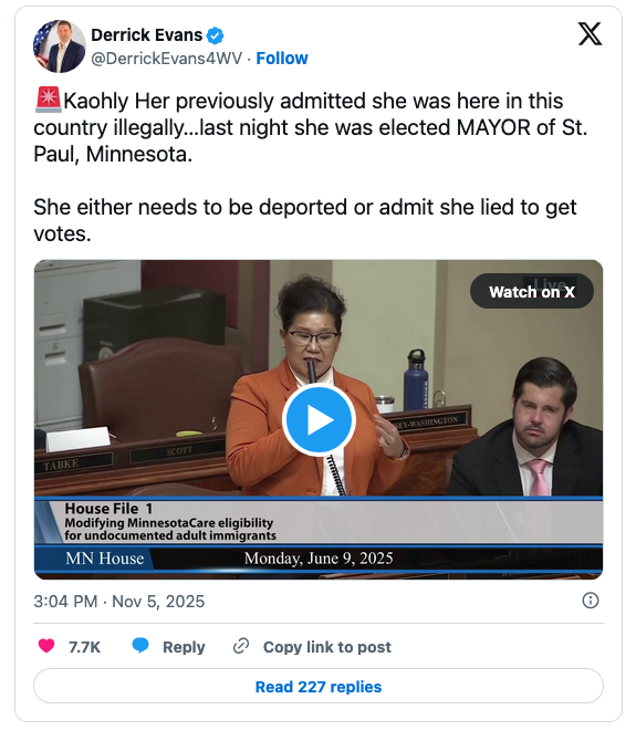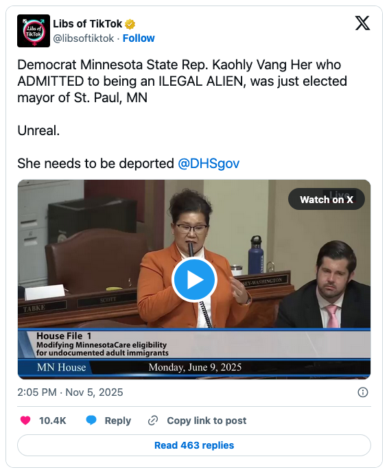 So also is the mayor-elect of St. Paul, Minnesota, far-left Democrat Kaohly Her. Not only is she not a citizen, but she is an illegal alien. She proudly divulged that interesting fact in June on the floor of the Minnesota House, where she served as a representative for District 64A.