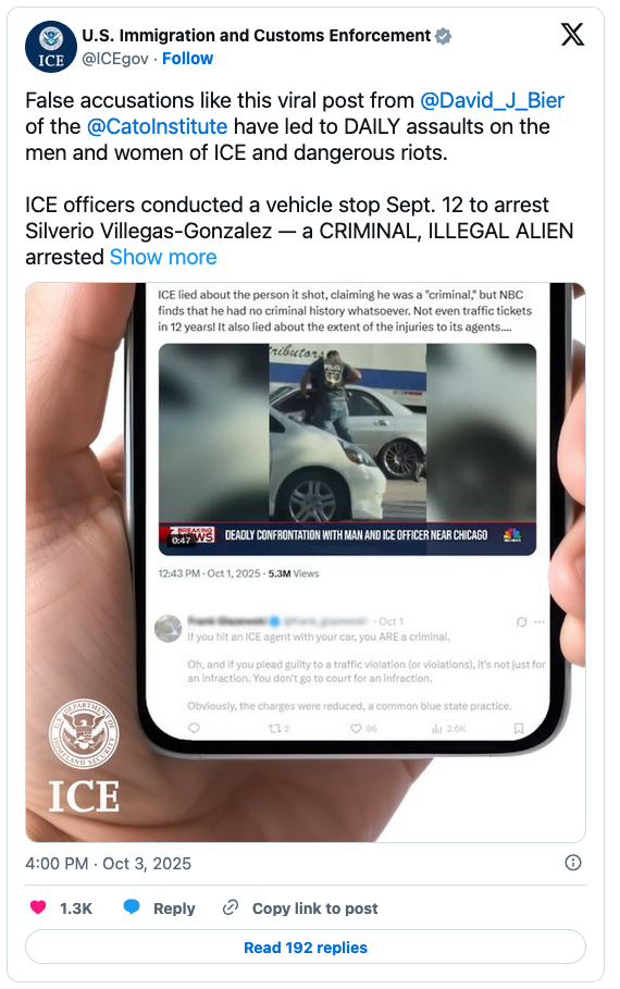 In fact, as ICE reported at the time, Gonzalez was a criminal “arrested in Chicago several years ago for reckless driving, assault, speeding, [and] driving without a license or insurance who pleaded guilty to four traffic violations.” When he tried to speed away, he dragged one of the agents a “significant distance.” Thus the shooting. The ICE agent who shot and killed Renee Good last week in Minneapolis was also dragged by an illegal alien who attempted to flee in his car.