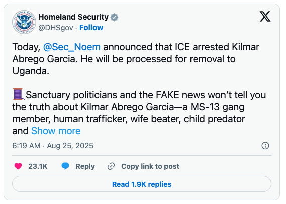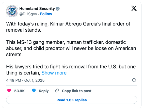 “With today’s ruling, Kilmar Abrego Garcia’s final order of removal stands,” the DHS X feed said: