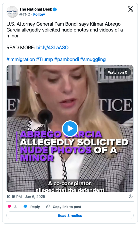 As well, U.S. Attorney General Pam Bondi alleged, Garcia solicited nude photos of a minor and participated in the murder of a rival gang member’s mother.