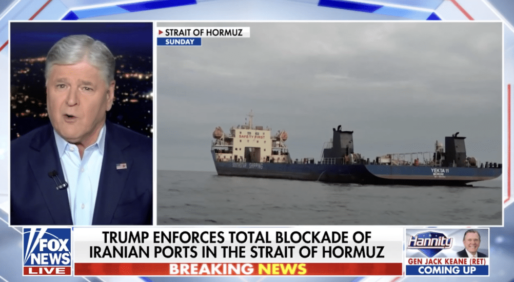 “Iran’s threats, extortion, and partial blockade of the Strait have turned out to be a massive strategic blunder,” Hannity said. “President Trump has now flipped the script and is enforcing a total blockade of Iranian ports inside the Strait. As a result, the Iranian regime has no access to outside markets — that means no ability to bring in any money at all into their country. They have no ability to sell their oil and, according to analysts, Iran’s already-fragile economy will be brought to its knees.”