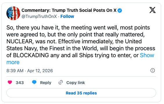 “THE STRAIT OF HORMUZ IS COMPLETELY OPEN AND READY FOR BUSINESS AND FULL PASSAGE, BUT THE NAVAL BLOCKADE WILL REMAIN IN FULL FORCE AND EFFECT AS IT PERTAINS TO IRAN, ONLY, UNTIL SUCH TIME AS OUR TRANSACTION WITH IRAN IS 100% COMPLETE,” Trump wrote: