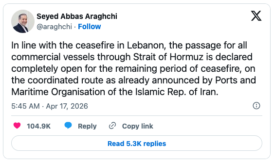 “In line with the ceasefire in Lebanon, the passage for all commercial vessels through Strait of Hormuz is declared completely open for the remaining period of ceasefire, on the coordinated route as already announced by Ports and Maritime Organisation of the Islamic Rep. of Iran,” Araghchi wrote on X at 8:45 a.m.