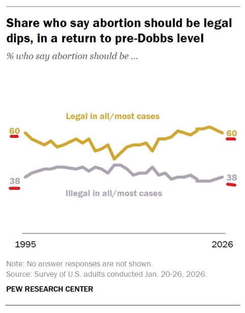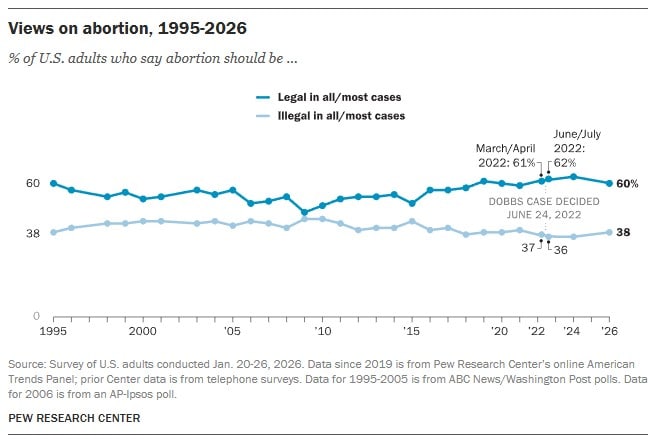 The year these two conflicting views closed the narrowest gap was in 2009 when 47% of Americans believed abortion should be protected and 44% believed it should be substantially restricted. The highest point the pro-life view reached since 1995 when Pew started tracking this question was 44% in 2009 and 2010. It nearly regained that height with 43% in 2015. The peak for the pro-abortion view was 63% in 2024, and it only hit the low 60s in 1995, 2019 (61%), 2020 (60%), 2022 (62%), and 2026.